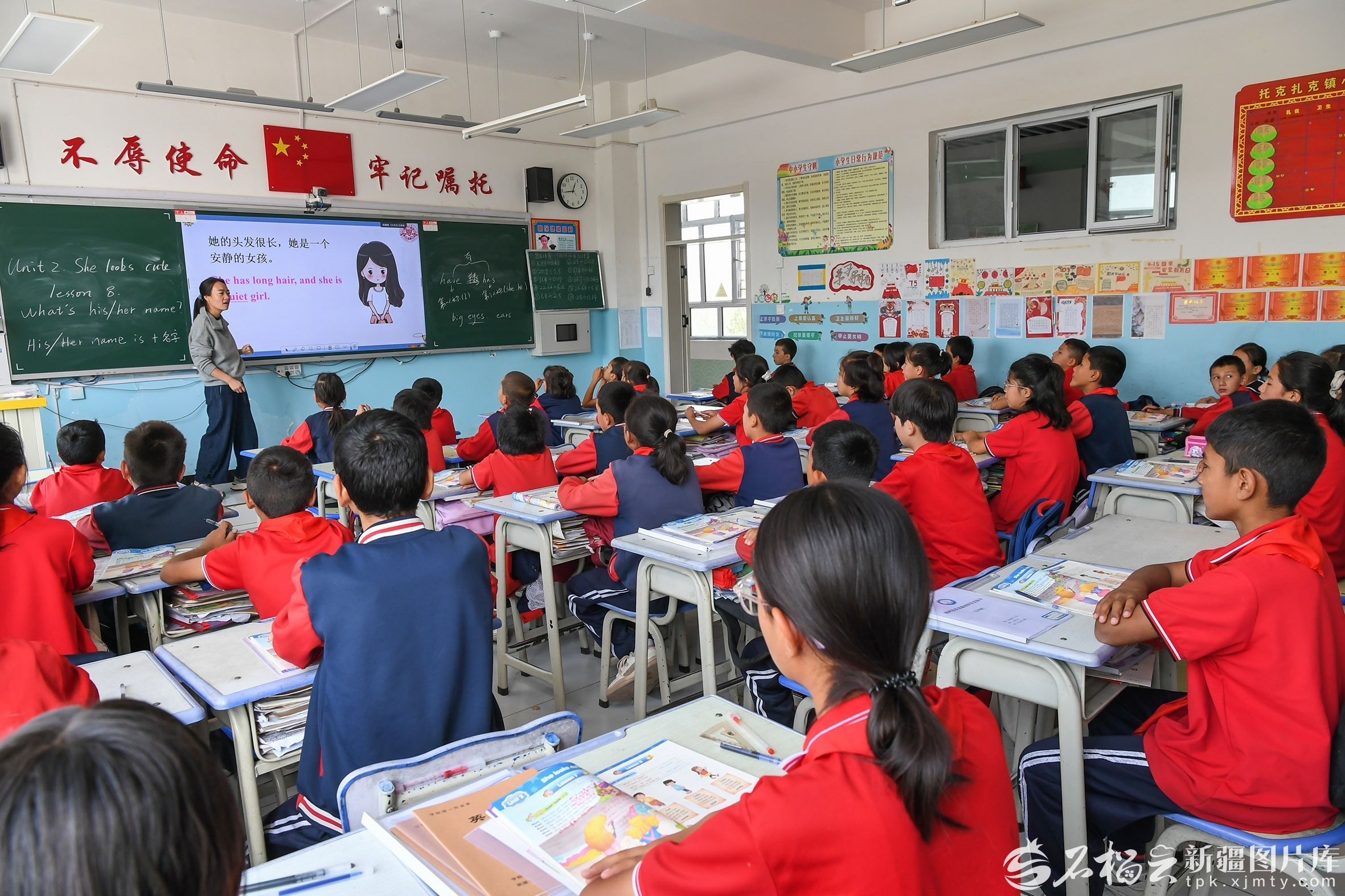 9月19日,疏附县托克扎克镇中心小学学生在宽敞明亮的教室上英语课。