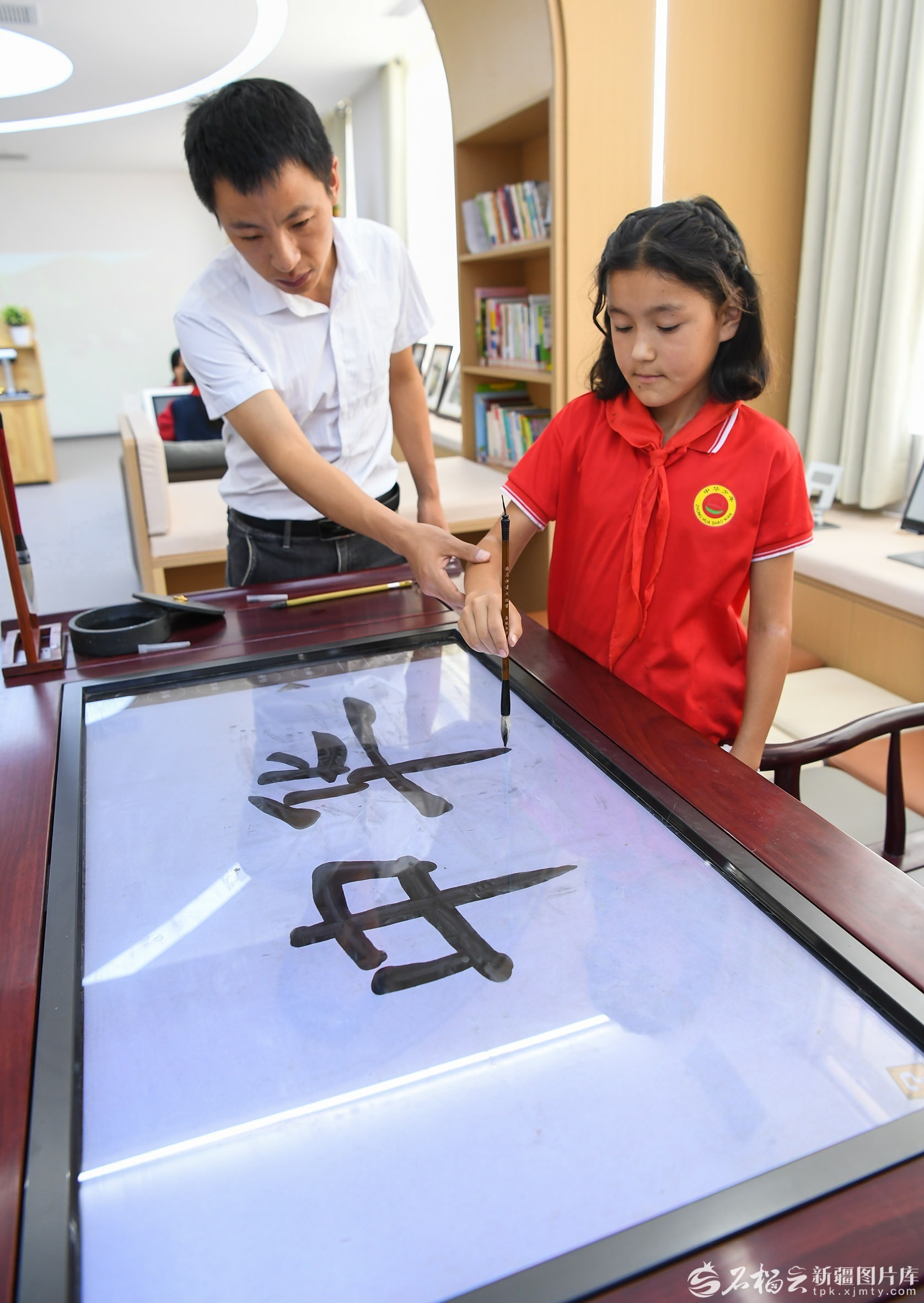 9月19日,疏附县托克扎克镇中心小学学生援疆教师的指导下学习书法。