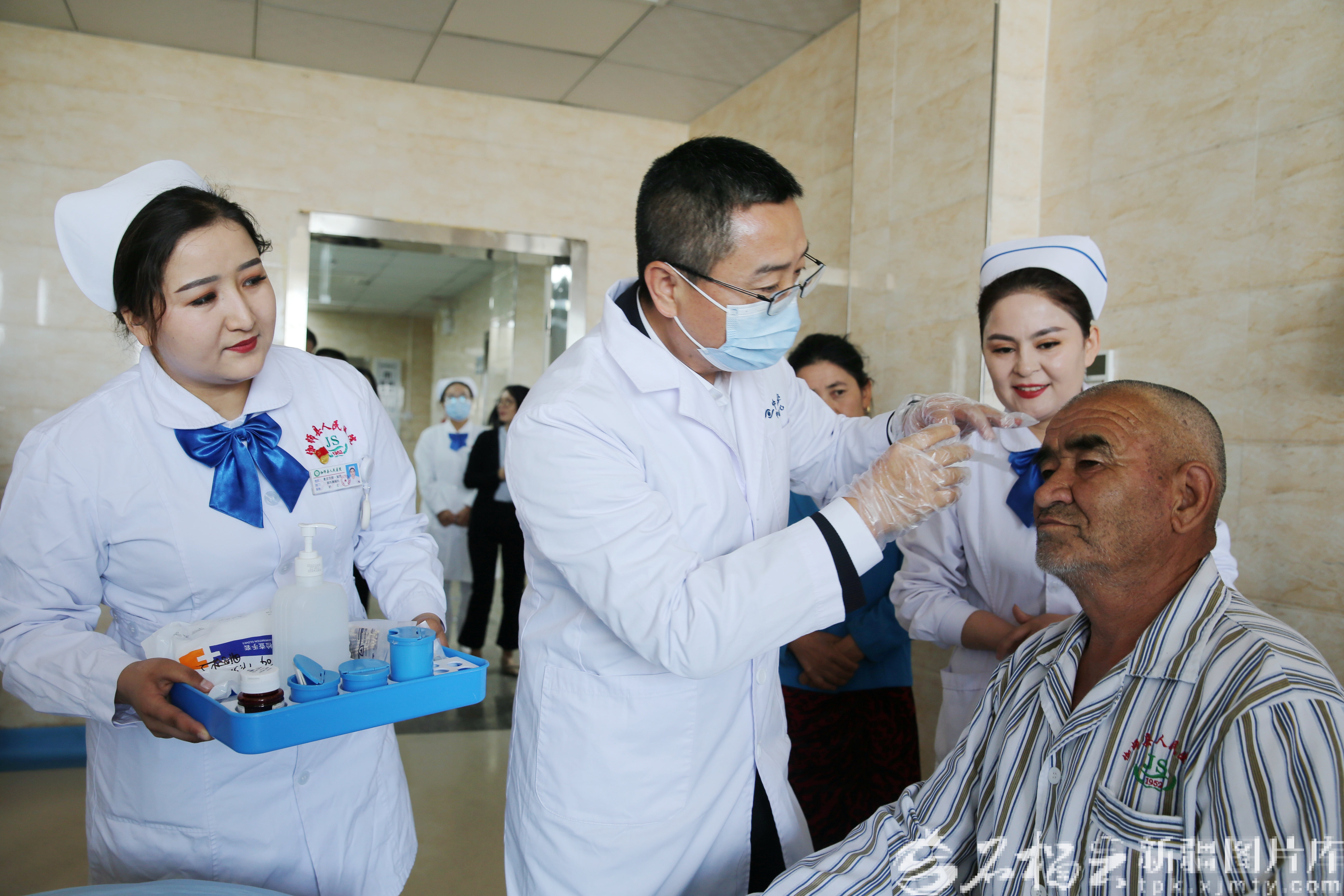 4月25日,中山大学中山眼科中心专家为伽师县做完手术的白内障患者摘取纱布。石榴云/新疆日报记者 何新社摄