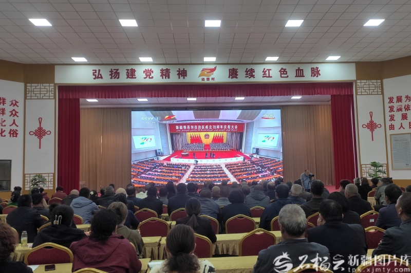 9月25日上午,在尉犁县兴平镇达西村村委会的达西礼堂内,各族干部群众收看新疆维吾尔自治区成立70周年庆祝大会直播。唐雪芹摄