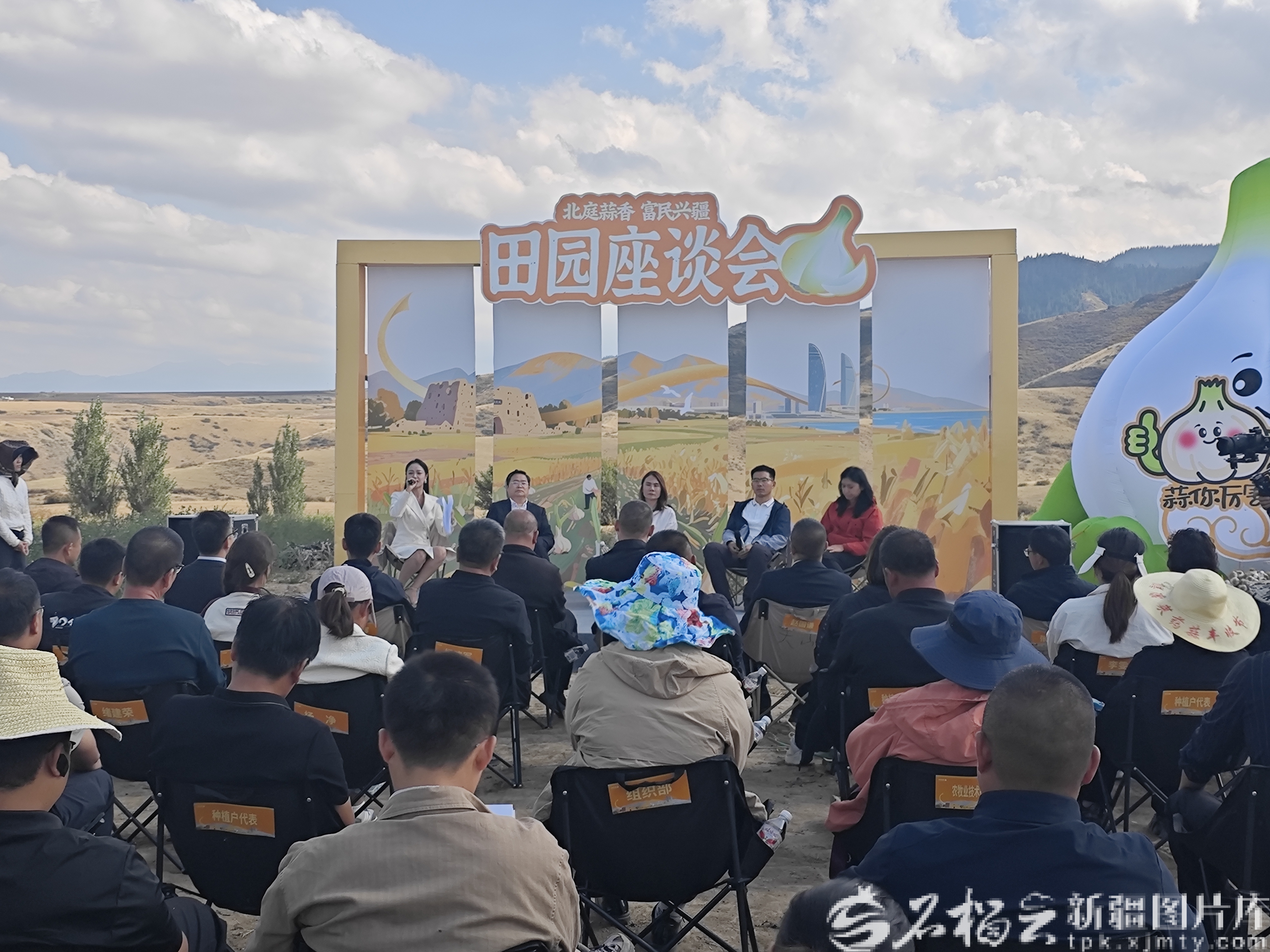 2025年吉木萨尔县大蒜文化科普活动期间,专家与新地乡蒜农交流大蒜种植技术。石榴云/新疆日报 记者 宋海波摄