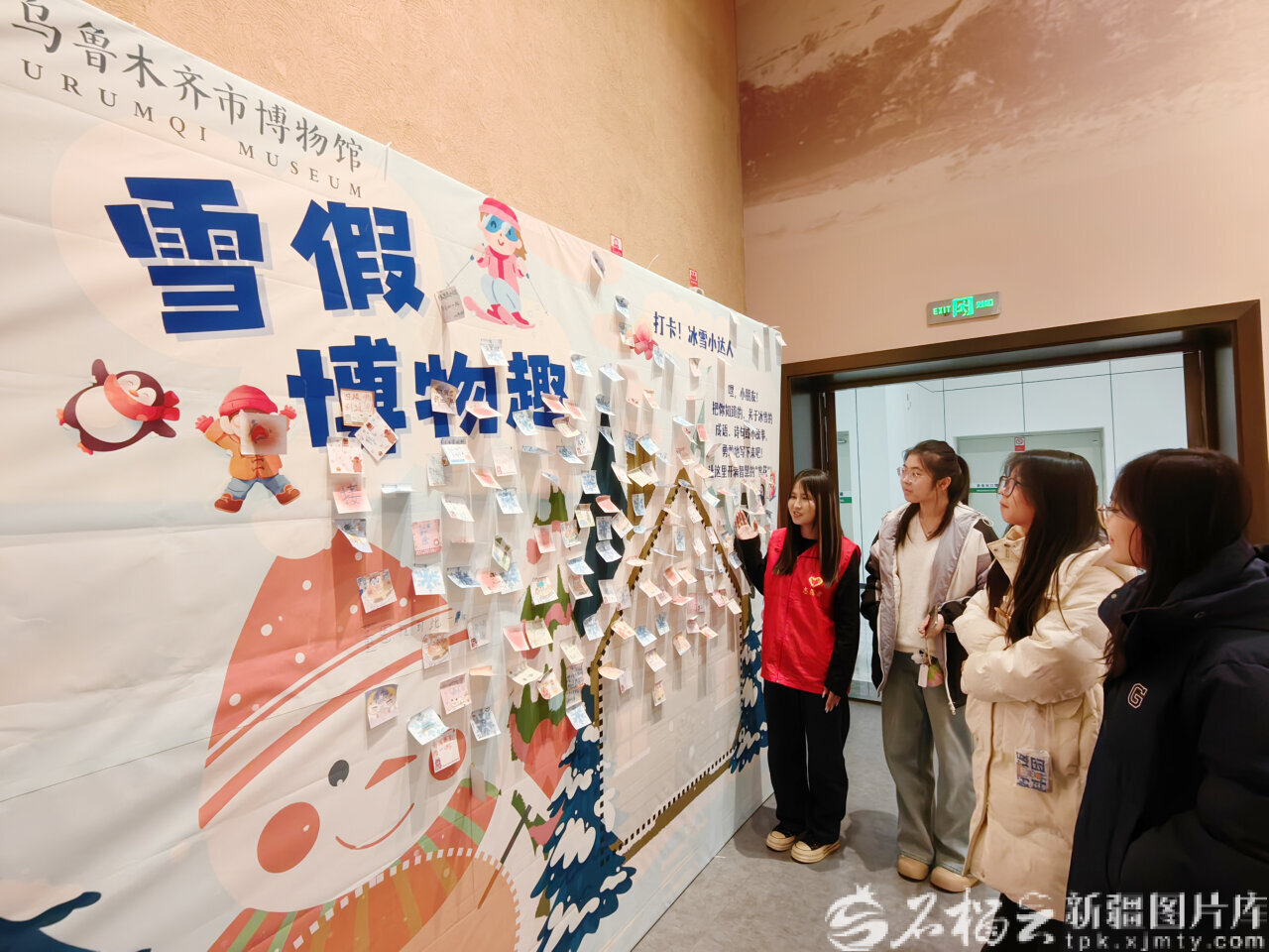 12月1日,在乌鲁木齐市博物馆,志愿者介绍雪假留言墙的相关情况。