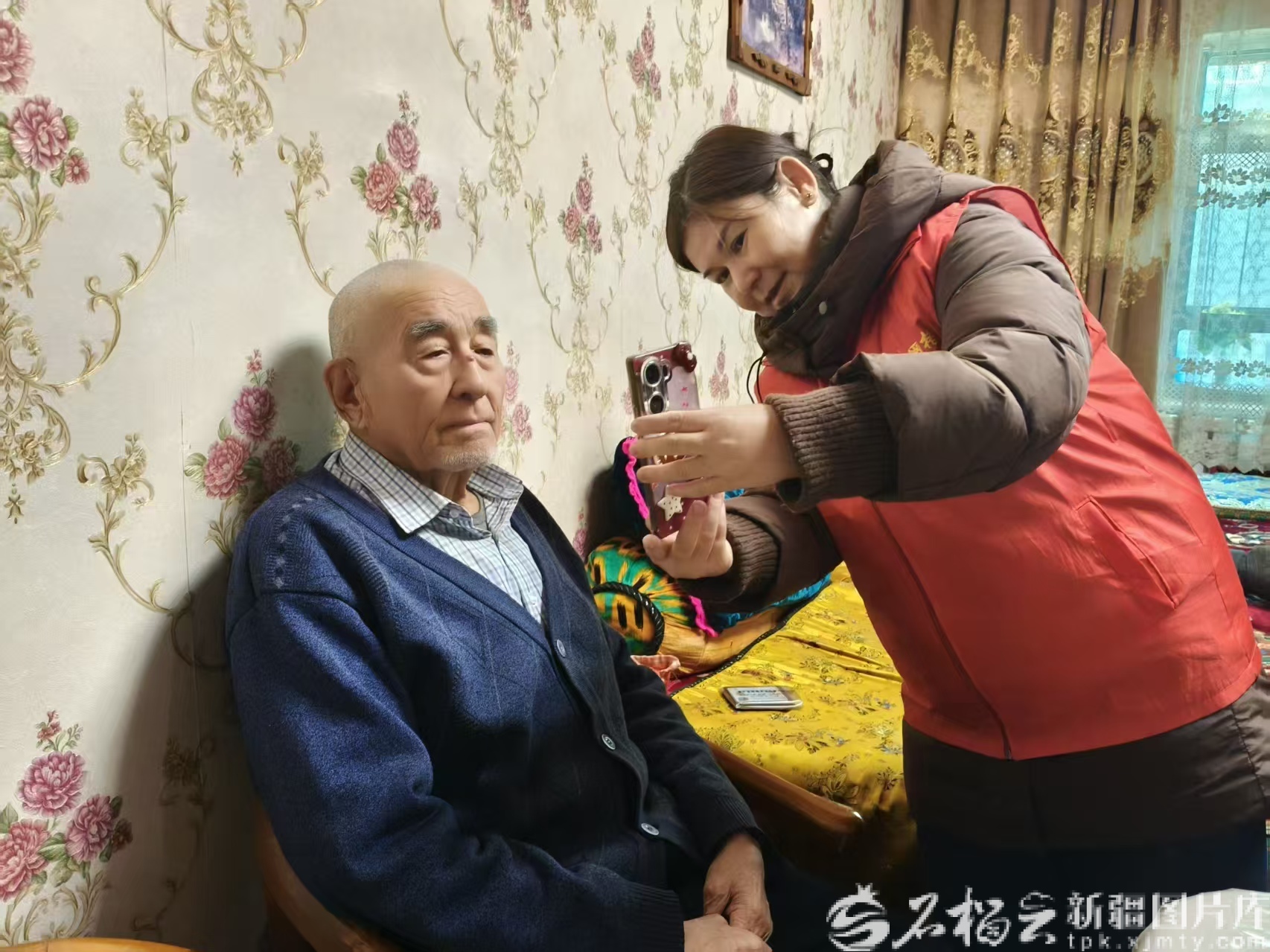 12月2日,吐鲁番市高昌区老城路街道广场社区工作人员来到老人家中,帮老人完成高龄津贴的人脸识别。吐鲁番市高昌区老城路街道广场社区居委会供图