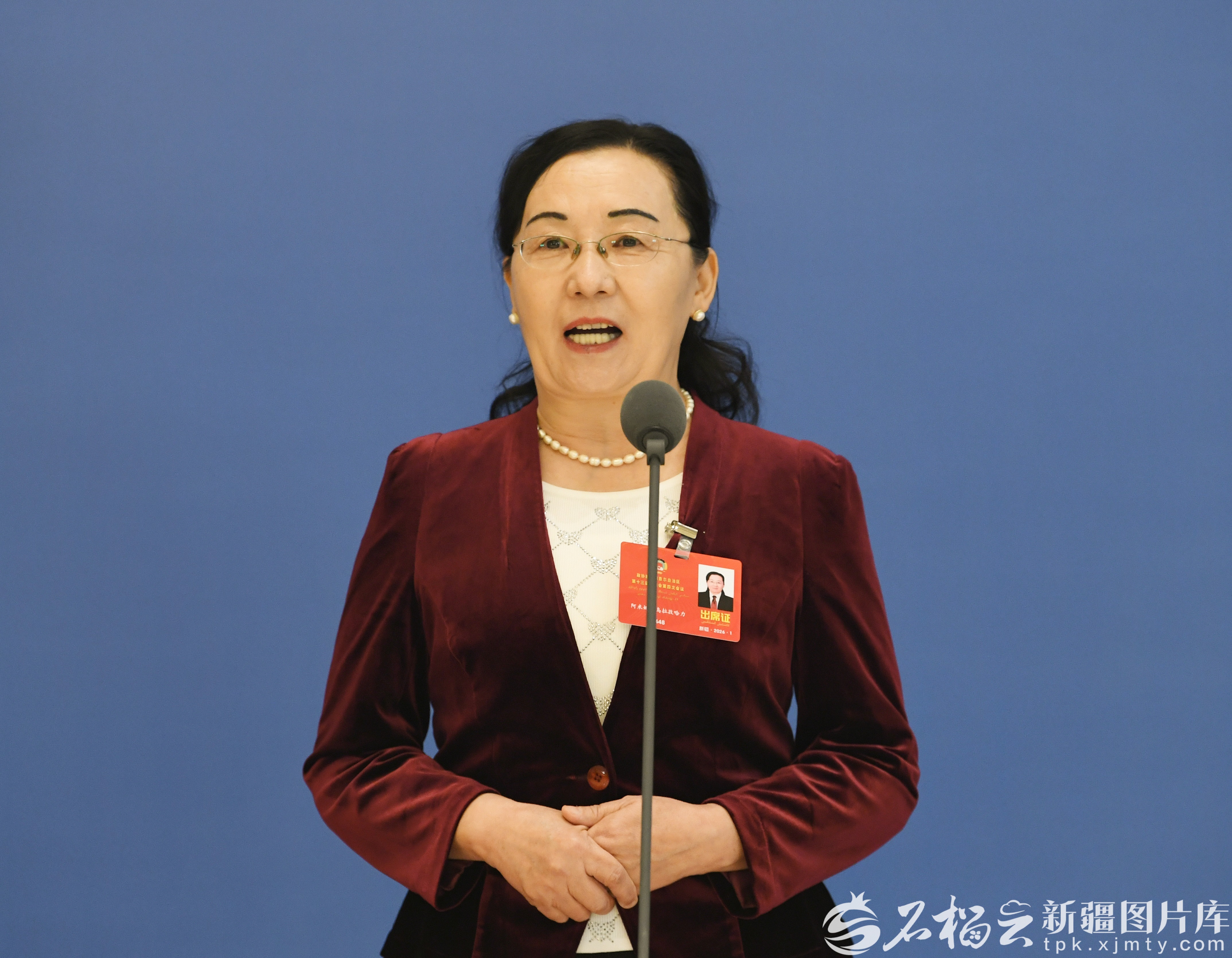乌尔娜委员答记者问。石榴云/新疆日报记者约提克尔·尼加提摄