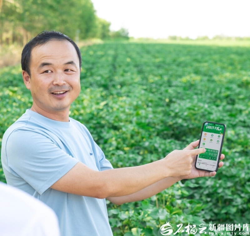 呼图壁县大丰镇红柳塘村棉农借助智能水肥一体化平台,通过手机操作完成棉花浇水与施肥工作(2025年8月3日摄)。何龙摄