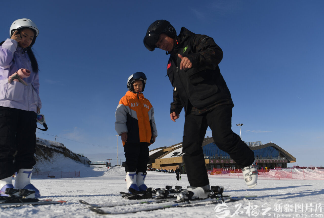 2月3日,额敏县也迷里滑雪场,教练为游客教授滑雪技巧。