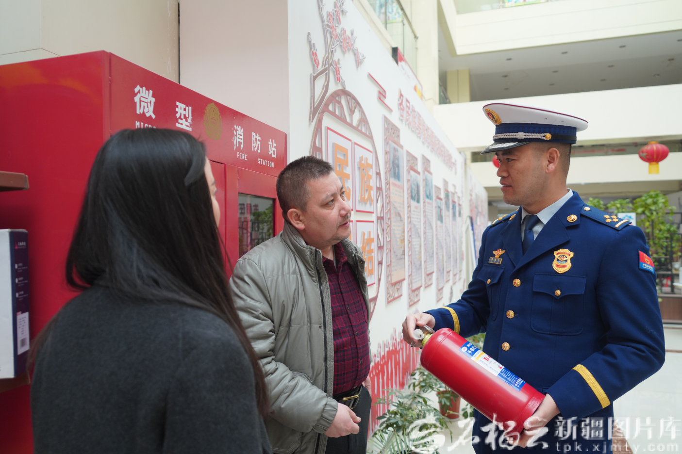 李运飞(右一)在库车市的社区听取意见建议的同时,向工作人员讲解灭火器正确使用方法。本人供图