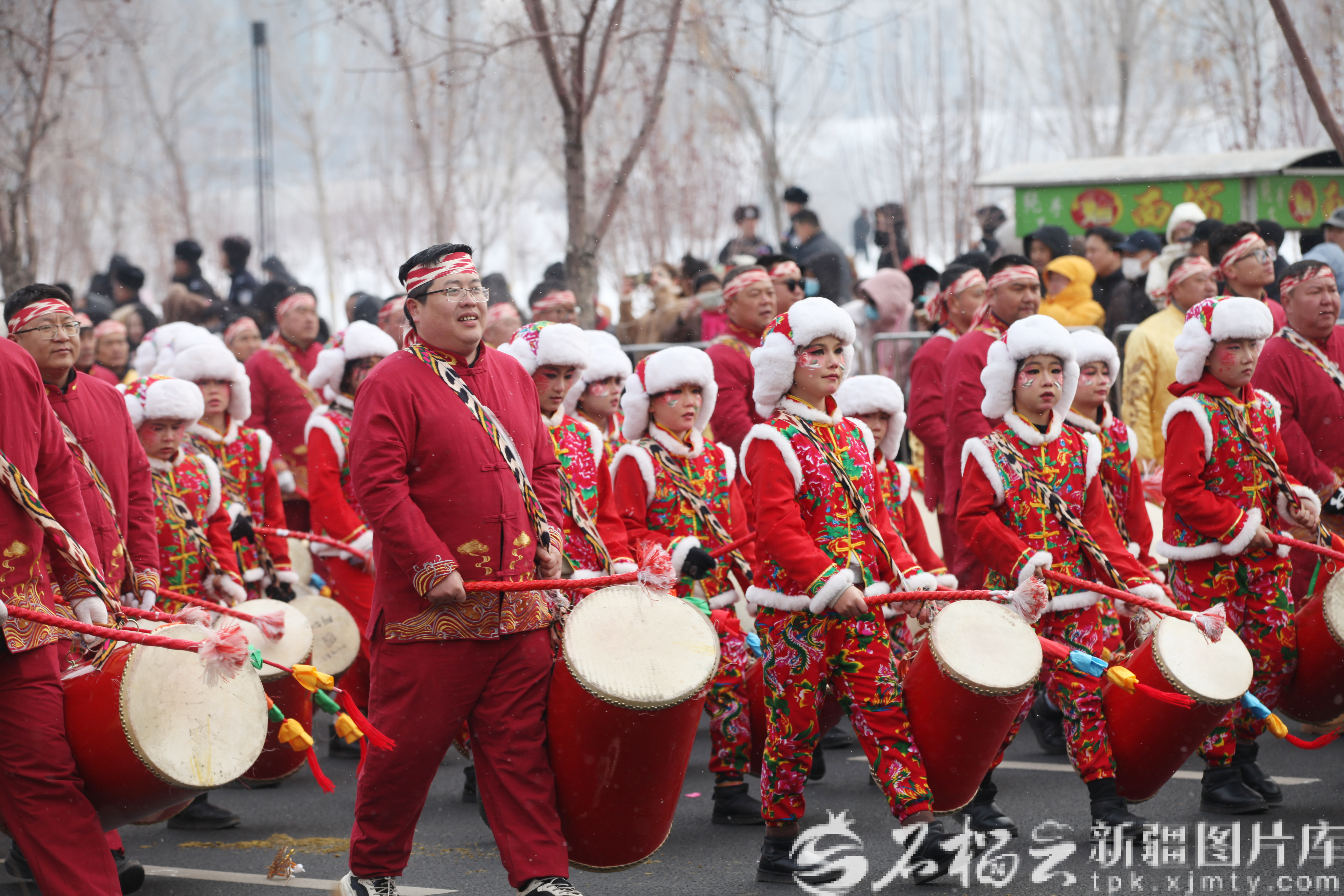 2月26日,乌鲁木齐市在文化中心举行第二届“打起手鼓舞起龙”群众社火巡游活动,水磨沟区盛世欢歌锣鼓队正在巡游表演。李林墨摄