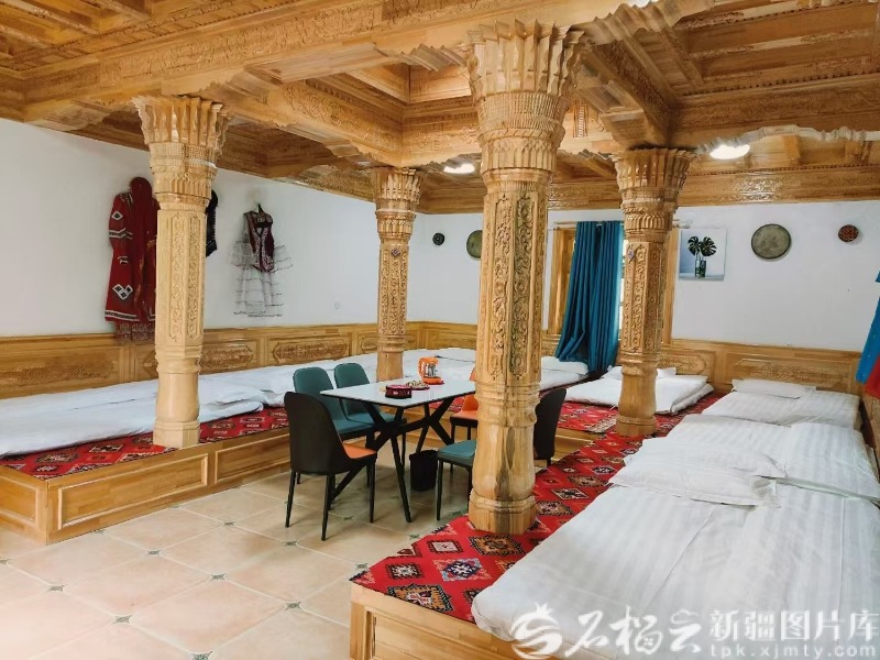 如今,老村委会大院变身“杏花里”主题民宿,由闲置库房打造成的当地手工艺品展厅,展示了牦牛毛挂毯、刺绣枕头、雕花木器等工艺品,让游客在休憩中感受塔吉克族民俗风情。旧校舍则被改造为25间特色客房,配套建设可容纳60人就餐的“峡谷食堂”,既解决了游客住宿就餐难题,又保留了老建筑的原貌韵味。