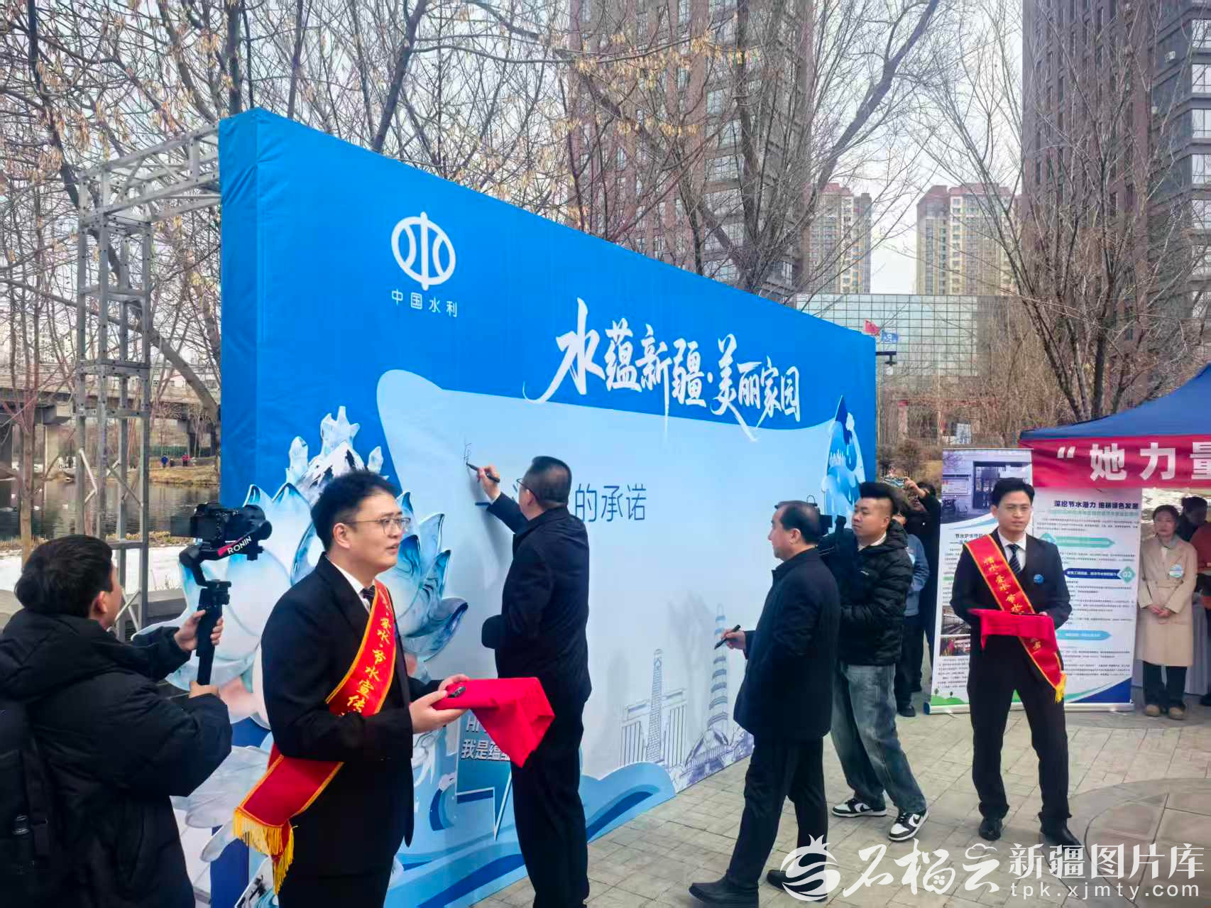 3月22日,乌鲁木齐市“水务开放日”多元化体验区内,众人在节水承诺墙上签字留言。天山网-新疆日报记者 康颢严摄