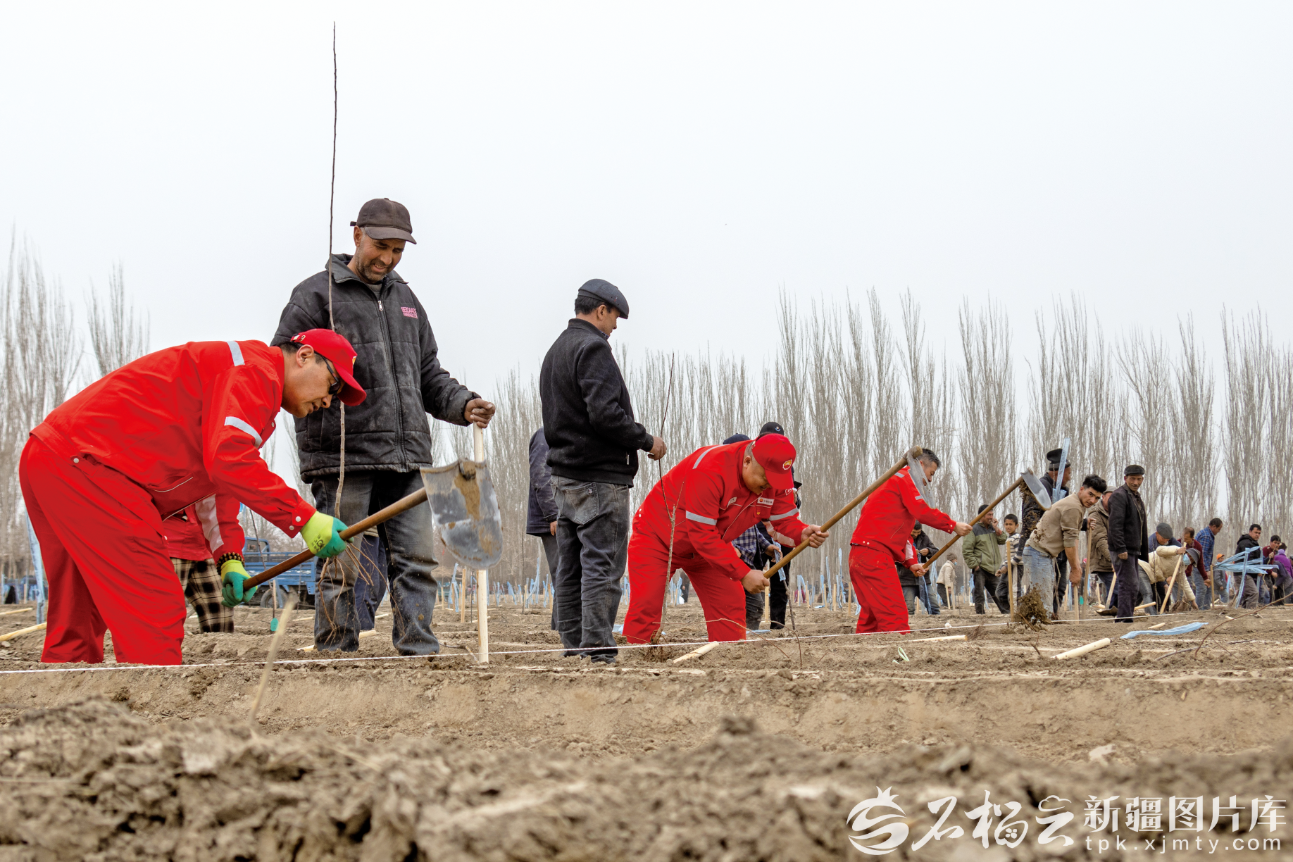 3月15日,中国石油新疆油田公司驻泽普县依克苏乡托皮恰村工作队队员与村民一起栽植苹果树苗。张昀 摄