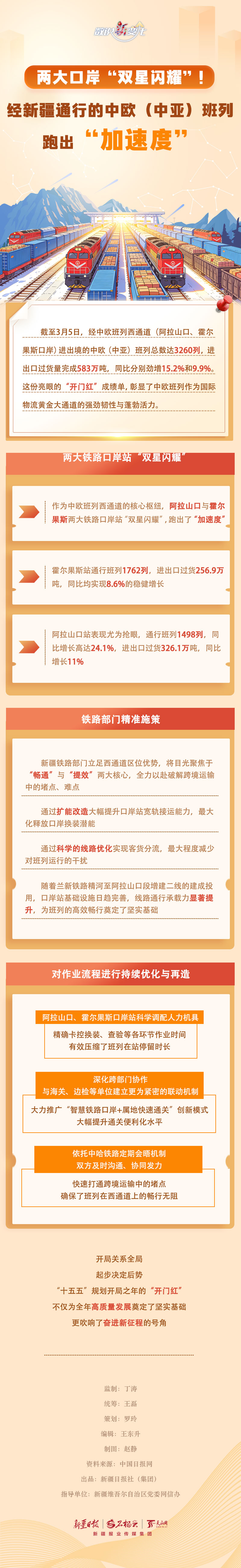 截至3月5日,今年经中欧班列西通道(阿拉山口、霍尔果斯口岸)进出境的中欧(中亚)班列总数达3260列,进出口过货量完成583万吨,同比分别劲增15.2%和9.9%。作为中欧班列西通道的核心枢纽,阿拉山口与霍尔果斯两大口岸表现如何? 新疆铁路部门为保障班列高效畅行做了哪些努力?本期《数说“新”变化》一起来看看。
