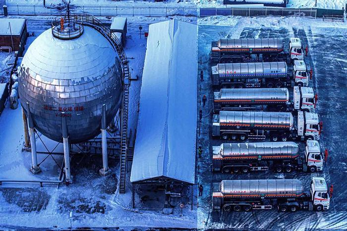 资料图:新疆油田公司二氧化碳槽车在一家碳厂列队灌装二氧化碳,准备运到井场注入地层。徐志远 摄