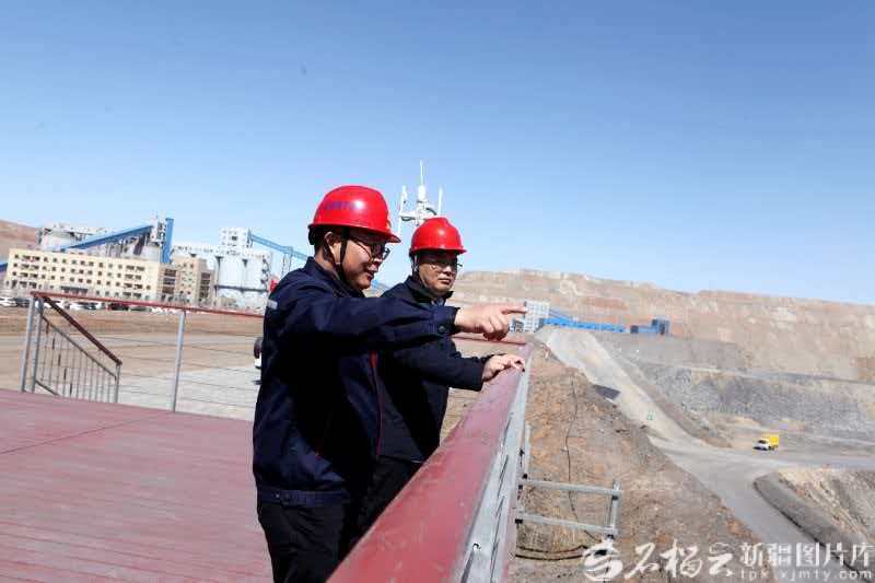 3月18日,新疆工程学院博士房新亮(右)在露天煤矿与企业技术人员交流。本人供图