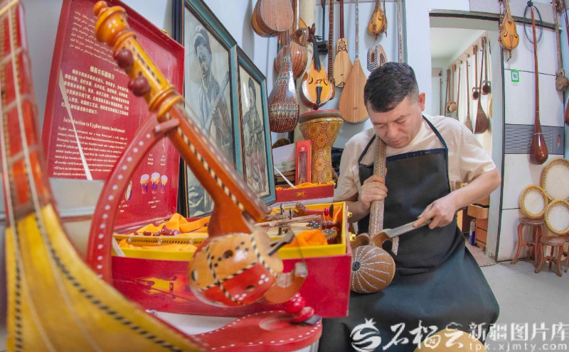 22岁那年,怀揣梦想,吐尔洪江告别家乡来到乌鲁木齐,开设了一家乐器店。从木料选材、风干处理,到琴身塑形、牛骨镶嵌、琴弦调试,每一道工序、每一个细节他都严苛把关。凭借着过硬的手艺,他很快成为业内公认的制琴好手。
