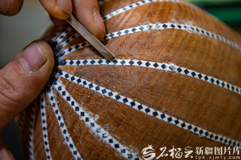 3月24日,吐尔洪江·居麦精心雕刻乐器表面。