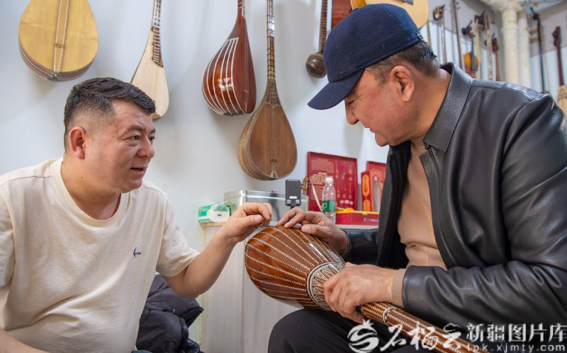 3月24日,吐尔洪江·居麦和新疆艺术剧院歌剧团演员哈木拉提·吾买尔(右)交流,向他征询乐器品质相关意见。