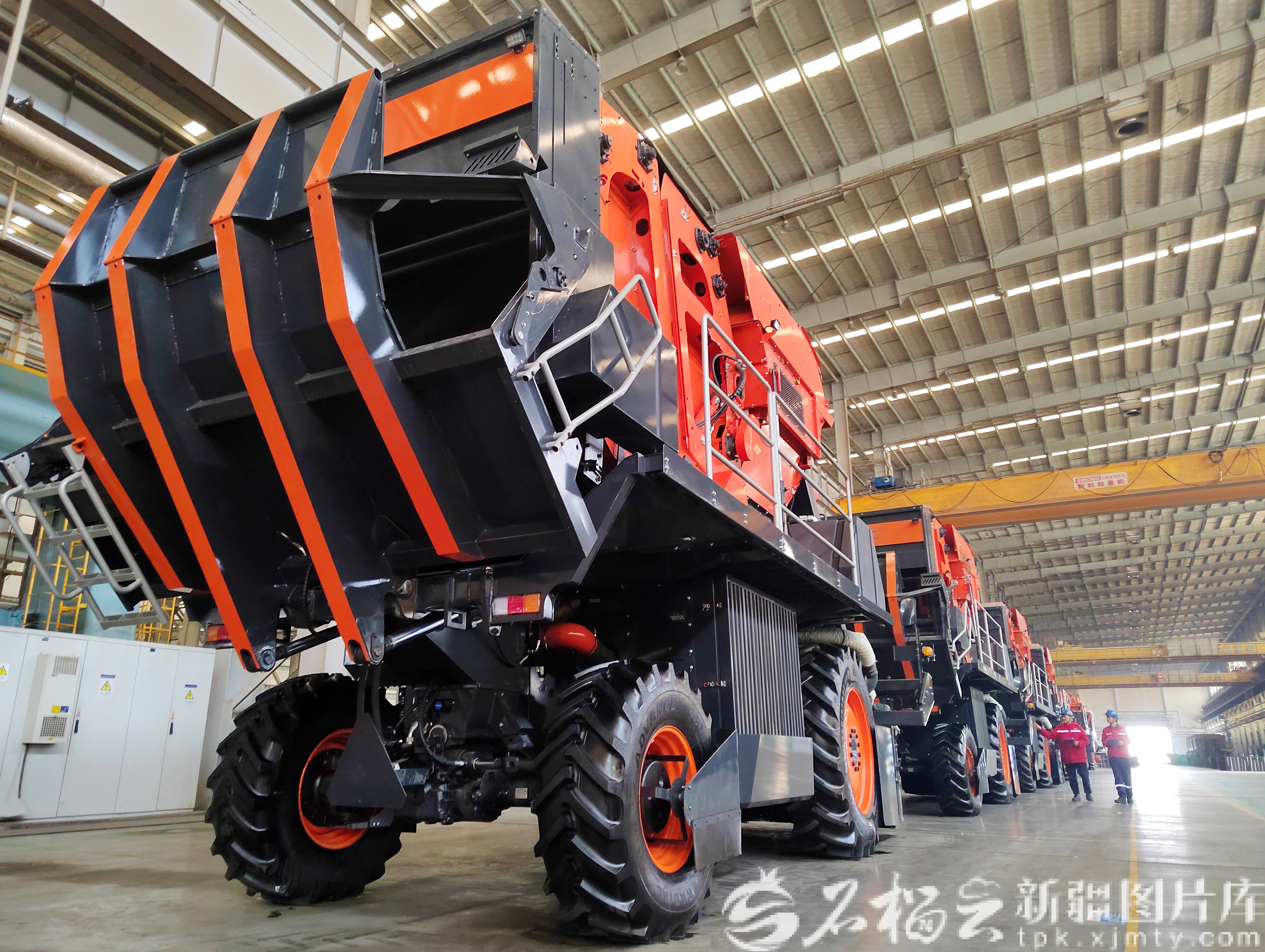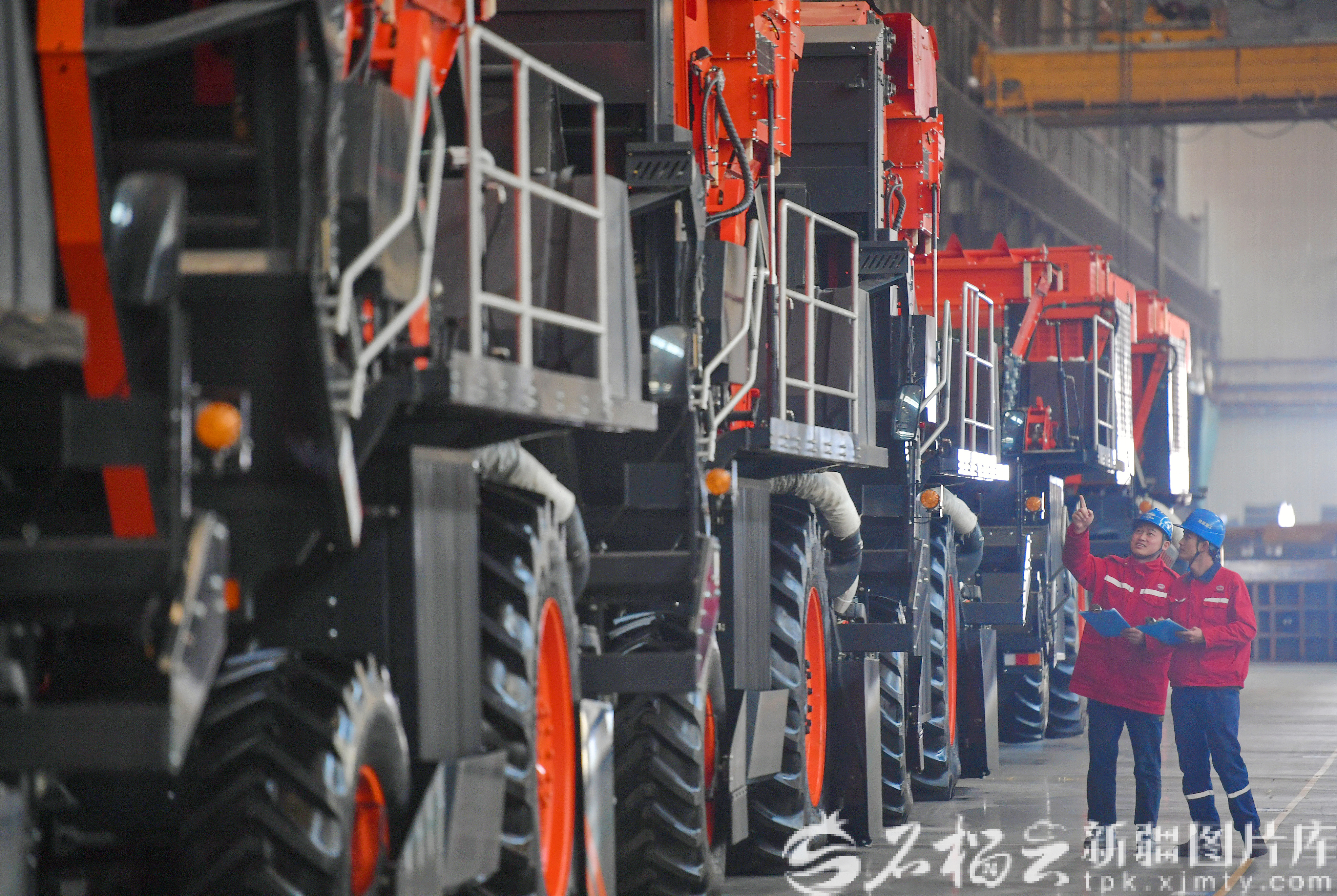 3月25日,工作人员在采棉机装配线上巡检。