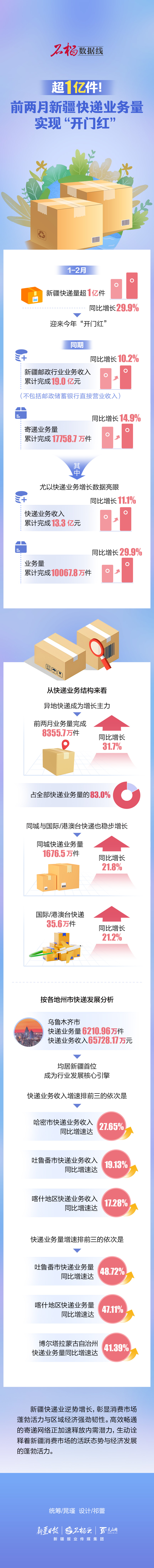 前两月新疆快递量超1亿件,同比增长29.9%,迎来今年“开门红”。